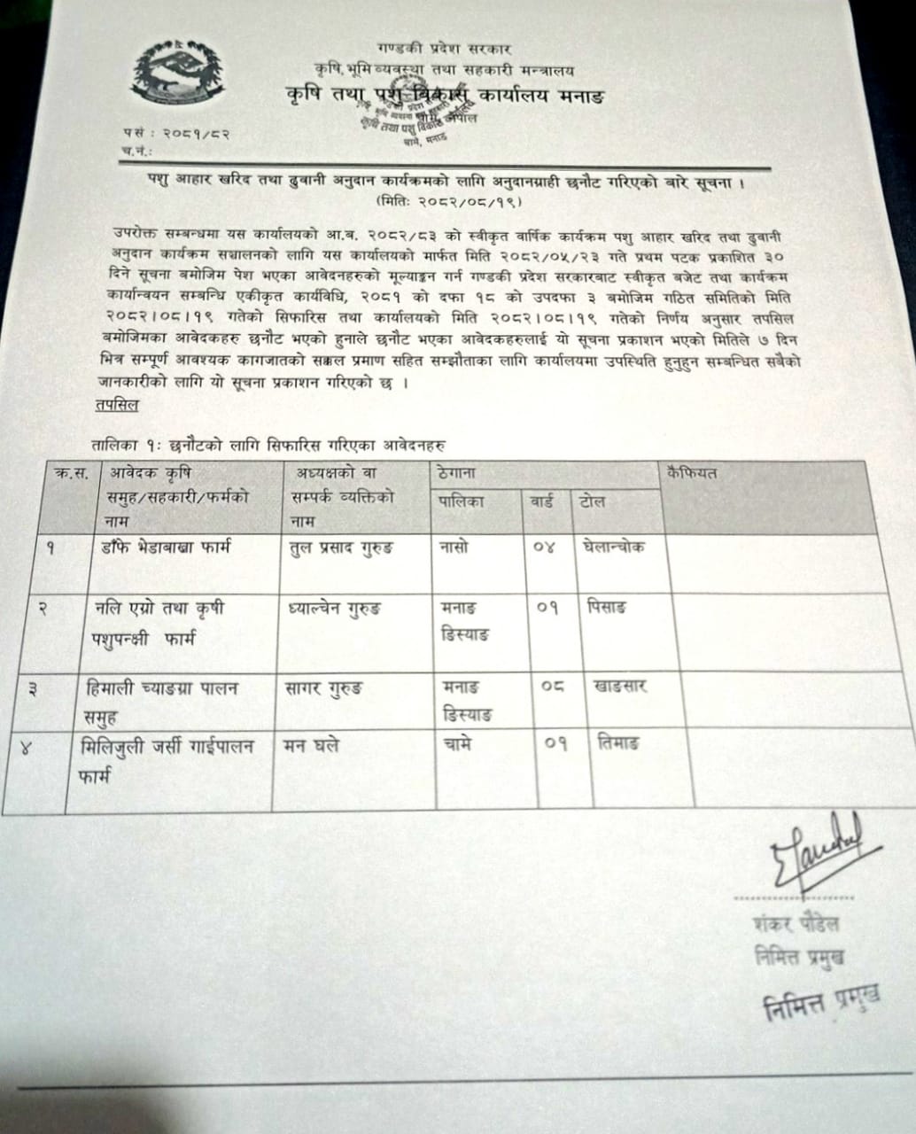 पशु आहार खरिद तथा ढुवानी कार्यक्रमको लागि अनुदानग्राही छनाैट गरिएको बारे सुचना 134.06 KB